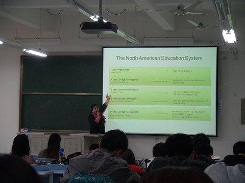 Frances Lin女士在简单地自我介绍及与学生互动后,着重介绍了北美的教育制度,并以美国和加拿大的大学制度介绍为主;同时,她就留学申请的过程中学校、专业的选择、具体申请过程及注意要点进行了讲解。最后,Lin女士对同学们提出的有关英语学习及北美留学问题作了解答。