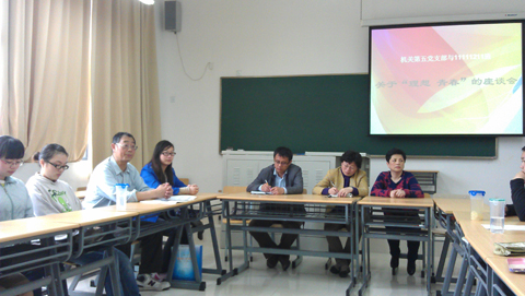 为促进学生确立正确的人生观、价值观,让同学们对“中国梦”有更为具体全面的认识,5月9日下午,机关第五党支部与外国语学院11111211班双结对在二教G208召开“理想,青春”的座谈会。机关第五党支部相关领导、老师,外国语学院辅导员孟乾及学生代表参加座谈会。