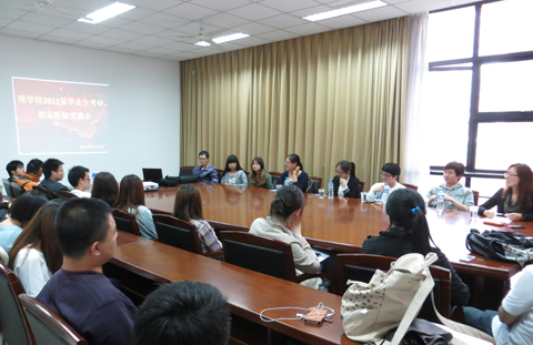 5月9日下午,理学院举行2013届毕业生“传经送宝”——考研、就业经验交流会。部分在考研、就业方面取得优异成绩的毕业生代表,为学院大三学生“传经送宝”,双方进行了全面而深入的经验交流。