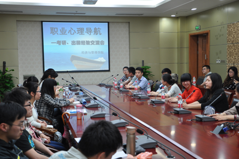 5月15日晚,经济与管理学院在图书馆B103召开考研、出国经验交流会,邀请了七名经管学院09级的毕业生为大家分享自身的考研及出国经验,为现场众多面临职业选择的同学们们提供了一次职业心理导航。