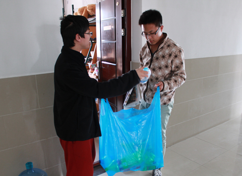 在五号楼楼委会成员的大力倡议和认真宣传下,活动得到了同学们的积极支持和配合。当楼委会成员到宿舍收取可回收垃圾时,大部分宿舍都已将准备好的废旧书报、饮料瓶等整理好,交给来收取的同学。经过近一个小时的努力,每个楼委会成员都“收获颇丰”。