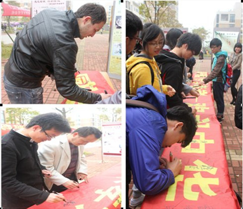 “百善孝为先”,为了弘扬孝敬父母的传统美德,一块块制作精美的二十四孝图展板井然地呈现在大家面前——《孝感动天》、《芦衣顺母》、《鹿乳奉亲》、《涤亲溺器》……一个个经典的孝道故事让驻足而观的同学们重温了古人的孝义并引导他们学会感恩父母、学会关爱他人。同时,以“感恩母爱,传承孝道”为主题的长条横幅铺陈开来,吸引了众多同学放慢脚步。在志愿者们热情的宣传下,大家纷纷积极响应,落笔留下最真挚的祝福,一名外国友人也驻足留下了自己的祝福。“妈妈,我爱你”、“世上只有妈妈好”、“祝老妈节日快乐,身体最重要”、“祝福雅安”、“雅安,Fighting!”、“雅安加油,四川雄起”……真诚的祝福贴满了祝福许愿树。