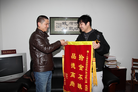 3月4日上午,怀着万分激动的心情,两位外省市在沪开办企业的孙先生夫妇来到学校,诚挚地送上一面锦旗,感谢我校电气与电子工程学院12级朱庭明同学的拾金不昧,更感谢学校的培养让学生们具有诚信无私的美德。