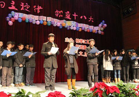 在全国掀起“欢庆十八大、学习十十八大”的热潮之际,人文学院于12月24日晚在图书馆B106室举办了以“唱响主旋律,欢庆十八大”为主题的新年诗歌朗诵暨“青春力量”优秀学生表彰大会。此次活动由校学工部、校团委主办,人文学院承办。教务处处长周小理、校学生处处长熊焰、人文思政学院院长刘红军、副院长赵敬立、苗瑞凤,校团委副书记陈雷等出席晚会。