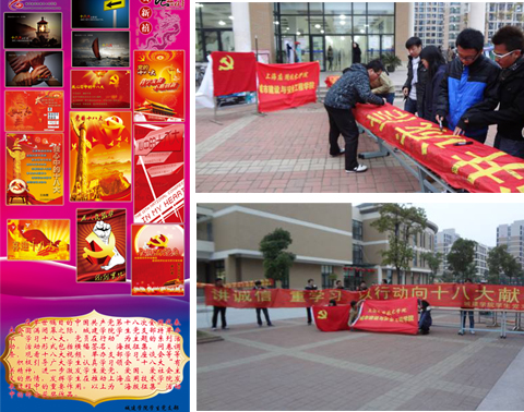 活动内容丰富多彩,包括悬挂宣传横幅、党员“十八大”签名、“喜庆十八大”海报征集、“十八大”问卷调查、观看“十八大”视频、举办学生支部“十八大”学习座谈会、党员思想交流会等等多种形式,积极引导广大学生认真学习领会“十八大”有关精神。