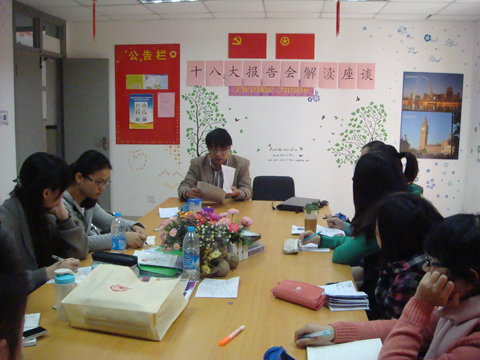 11月12日上午,外国语学院在15号楼党团活动室举行了十八大报告学生座谈会,外国语学院老师、党员代表、班委代表及学生代表参加座谈会。