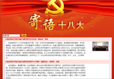 在中共十八大召开之际,为创新基层党组织建设,积极响应党员群众的期盼,轨道交通学院全体党员、党章学习小组学员近百人积极参与了由上海市基层党建组织的网上“寄语十八大”专题互动活动。