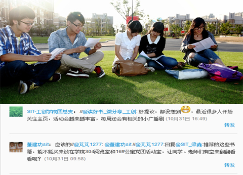 活动通过“读好书_微分享_工创”的主页平台,一方面发布推荐书单,包括名人传记、历史文学、名家散文和多部经典文学名著,一方面将粉丝@微博中的文学感悟、文艺小品和众多评论转发至主页,旨在激发同学们以微博的形式传递自己的思想和体悟,培养学院勤学善思的优质学风,为喜庆“十八大”的胜利召开和学校更名建设工作做出积极的努力。