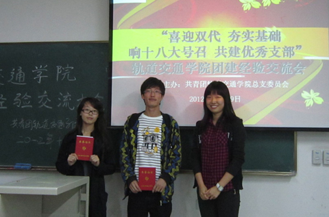 10月29日,轨道交通学院举行“响十八大号召、喜迎双代会,共建优秀支部”的团建经验交流会。学院学工负责人、团总支书记、学办老师及优秀团员代表和各班团干部参加大会。