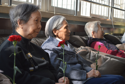 在护理人员的陪同下,老人们早早地穿戴整齐,来到演出现场。同学们祝老人们节日愉快、健康长寿,并向他们献花。合唱社用清澈明亮的歌声倾情演唱了《听妈妈将那过去的事情》、《歌声与微笑》等耳熟能详的经典歌曲,老人们跟着拍子,轻轻哼唱,犹若回到热情欢快的年轻时代,脸上洋溢着幸福的笑容。