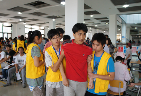 除了对参加无偿献血的同学的敬佩外,在本次活动的现场,我们还看到了另一批默默奉献的人——白玉兰志愿者。身穿黄色志愿者队服的他们,活跃在献血现场的每一个角落。搀扶引导、碘酒消毒、递送食物、记录血袋等都是他们要做的事情。默默忙碌着的他们,是校园里又一道亮丽的风景线。