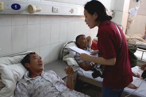 队员们前期收集资料,进行了大量的准备工作,经过认真研究讨论制定出了调查问卷。由于行程安排紧凑,到达目的地之后,大家就开始了紧张的调研采访工作。8月2日,小队第一站就来到了内乡县人民医院,了解医护人员、患者眼中的“新农合”。乡镇文化水平的欠缺在沟通上造成了很大的障碍,很多患者及家属无法独立完成问卷。队员们分头行动,深入每个病房悉心引导,详解每一道问题,与患者和家属讨论“新农合”的便民之处,并详细讲解报销范围和流程。在连续探访了十几个病房后,大家兴奋地听到,医患对新农合充满赞美,一位患病老奶奶还竖起大拇指说:“新农合,好得很!”看到患者脸上洋溢的淳朴笑容,队员们甜到了心坎儿里!