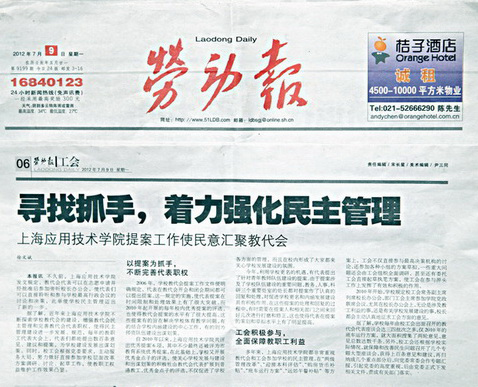 《劳动报》2012年7月9日第6版工会专版头条位置以《寻找抓手,着力强化民主管理》为标题,报道了上海应用技术学院民主管理方面的工作情况,对学校在党委领导下和在校长等行政领导支持下开展教代会的民主管理所取得良好成绩,予以充分肯定。