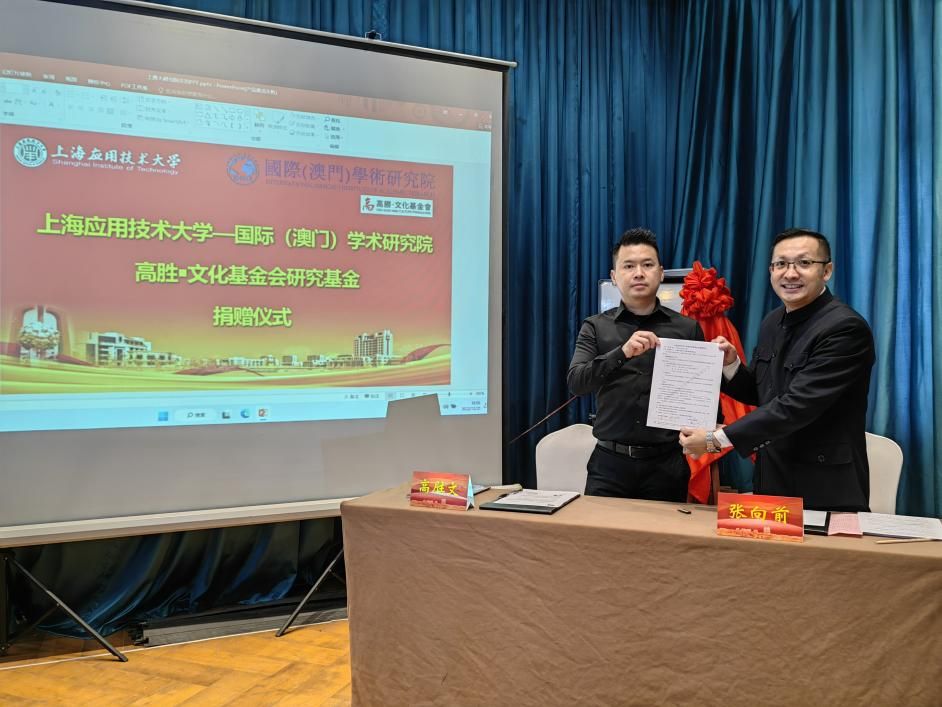 我校特聘教授、国际学术研究院院长高胜文总结过去论坛和合作成果时表示,论坛多项成果以不同的形式送呈政府相关部门,为共同建设世界重要人才中心和创新高地提供参考依据。高胜文感谢政府、企业、社团、学校及各专家学者的支持,期望透过多元的活动,推广、普及、促进各学术研究领域的繁荣和发展,并继续在各领域为社会建言献策、贡献力量,以实际行动践行爱国爱澳。他宣布高胜文化基金会向上海应用技术大学捐赠澳门币100000元(拾万元整),资助上海应用技术大学人文学院2024年各类经费。