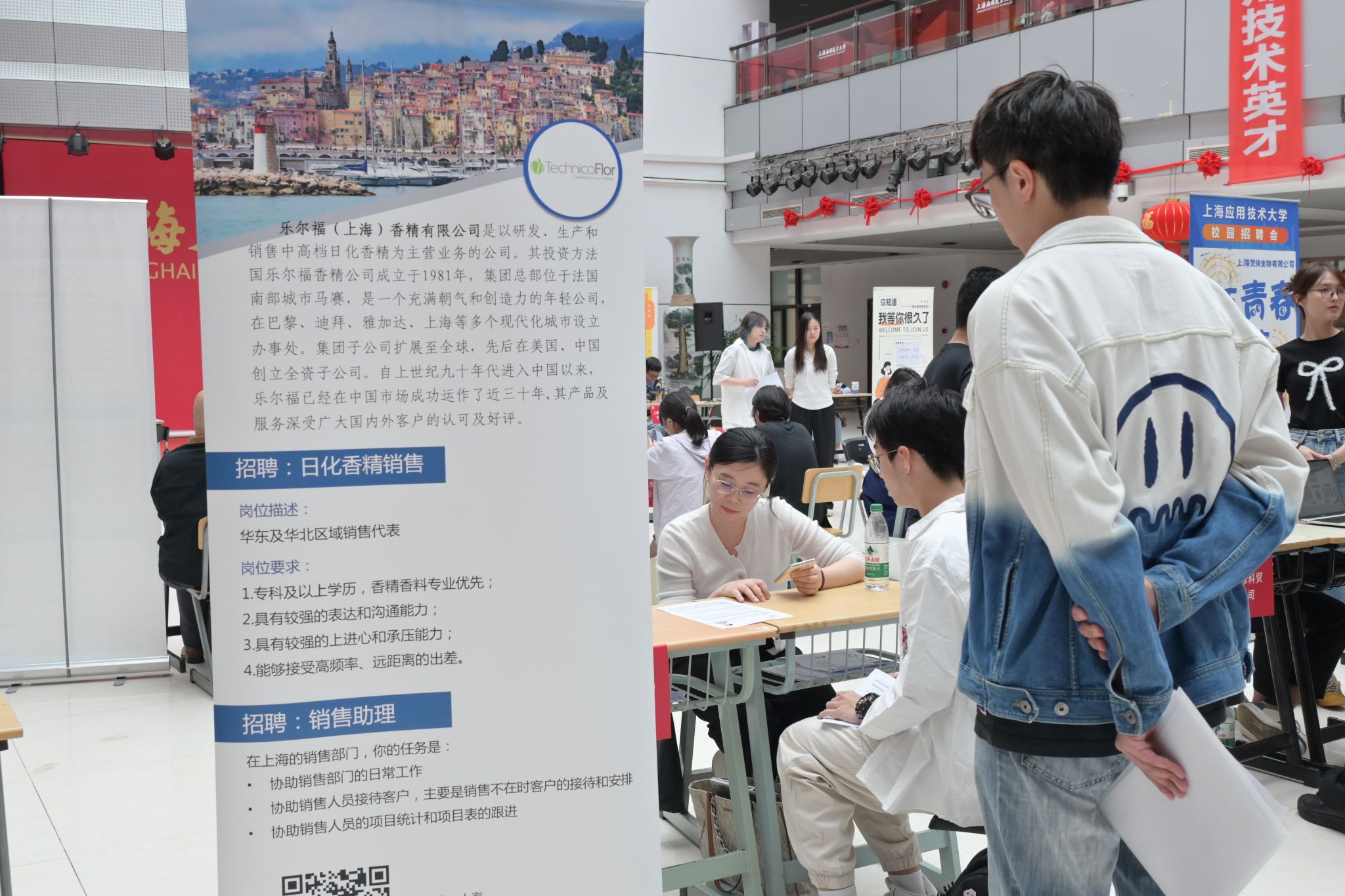本场招聘会吸引了25家优质企业和数百名求职者的积极参与,涵盖了香料香精、化妆品、生物、食品等多个领域,为毕业生们提供了100+个岗位。招聘会设置了就业指导服务区,奉贤区人社局就业指导专家李强、创业指导科首席卫张韬莅临现场,为学生提供个性化的就业创业指导和咨询服务,他们耐心细致地解答毕业生们的疑问,帮助学生更好地了解职场趋势和就业政策。