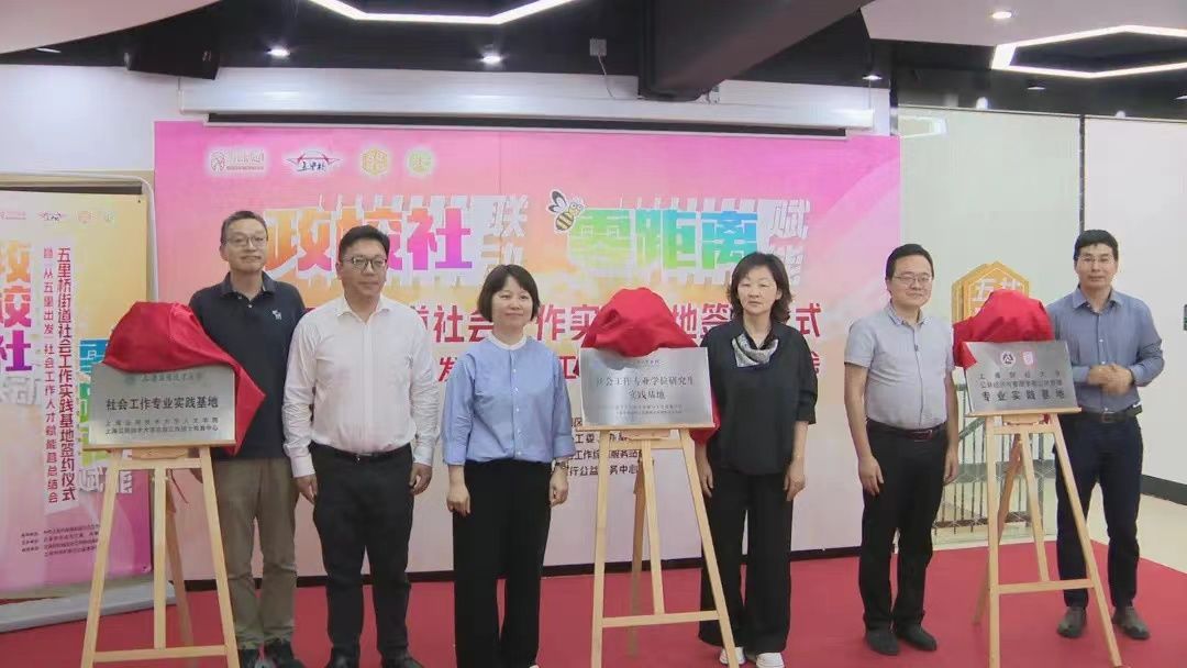 6月13日,人文学院与黄浦区五里桥街道举行“政校社”联动、“零距离”赋能共建签约活动暨社会工作专业实践基地揭牌仪式。黄浦区区委社会工作部副部长刘易、五里桥街道党工委书记曹炯、人文学院副院长(主持工作)李正东、复旦大学社会发展与公共政策学院社会工作学系、上海财经大学 MPA 中心负责人、人文学院研究生代表等参加活动。