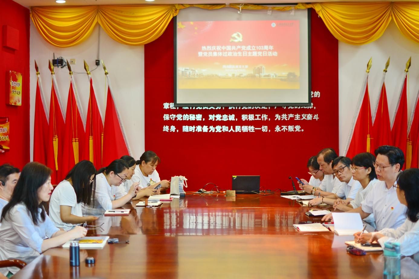 6月28日,在党的生日来临之际,图书馆举办“礼赞七一学党纪 团结奋斗新征程”主题党日活动暨理论学习中心组(扩大)学习,通过上好一次专题党课、集体过一次政治生日、重温一遍入党誓词、讲述一个入党故事、齐唱一次国际歌、赠送一本政治生日纪念册的“六个一”系列活动,热烈庆祝建党103周年,向党的华诞献礼。