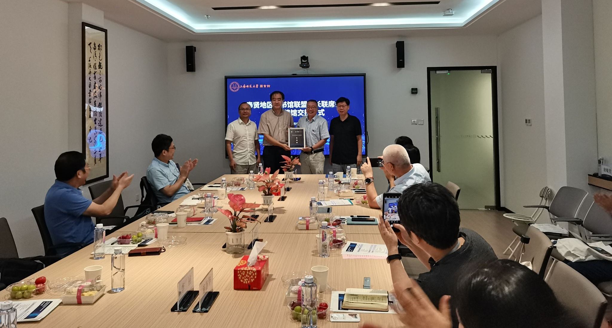 9月20日,奉贤地区图书馆联盟馆长联席会议暨轮值馆交接仪式在上海师范大学召开。华东理工大学图书馆党委书记朱广忠,上海师范大学图书馆党总支书记曹鹏、馆长贾铁飞,上海旅游高等专科学校图书馆馆长梁峥,奉贤区图书馆馆长施静华,上海商学院图书馆相关负责人,我校图书馆直属党支部书记董国文、馆长黄俊革出席会议。