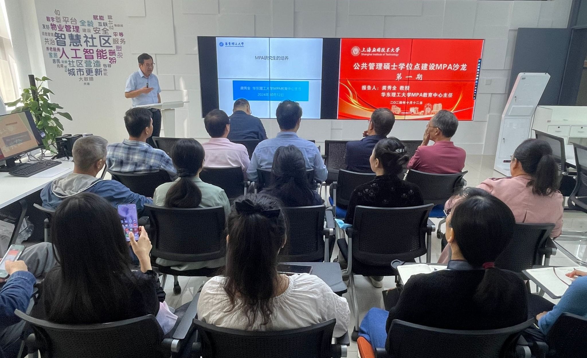 为进一步推进公共管理专业硕士(MPA)学位授权点的建设和高质量发展,10月12日上午,人文学院在奉贤校区智慧社区实验室举办了公共管理硕士学位点(MPA)沙龙。本次沙龙活动特邀华东理工大学MPA教育中心主任龚秀全教授作主题报告,人文学院副院长(主持工作)李正东主持沙龙。