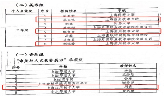 近日,由上海市教育委员会主办的“2021上海市普通高等学校音乐、美术教育专业本科学生和教师基本功展示活动”经专家评审后已公布评选结果。我校首次组织教师参加展示活动,校团委周青荣获“教师个人全能奖”二等奖,党委学工部丁元、城建学院蔡亚鸣、艺术学院解文金、刘海蛟等老师荣获“教师个人全能奖”三等奖,周青、蔡亚鸣分获“审美与人文素养展示”“专业技能”单项奖,学校荣获音乐组“优秀组织奖”。