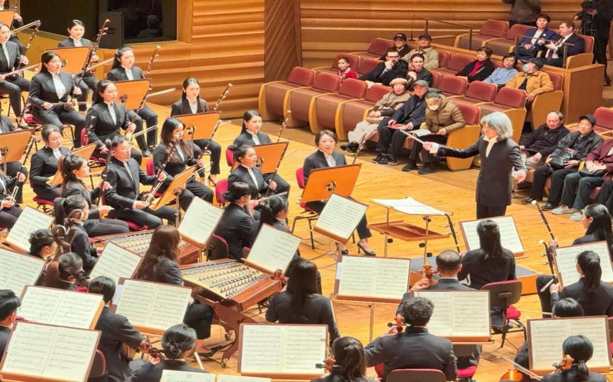 丝弦初振,满座寂然。音乐会以山西民歌《吉祥歌》变奏开场,观众随韵律渐入佳境。进入“北方回响”章节,《灞桥柳》的秦腔苦音如泣如诉,弦声呜咽勾勒长安折柳之思,引人悄然落泪。吴颂今先生的成名曲《井冈山下种南瓜》唢呐骤起时,永新民歌的欢快气氛与浓郁乡土气息相映成趣,观众席爆发的掌声经久不息。随后的“边疆彩绘”章节中,《楼兰新娘》以塔吉克音乐语汇向世人诉说昔日的繁华,与穿越岁月的悠长悲愁;《雪域传说》以双笛描摹鹰隼盘旋,文成公主入藏的历史与丝绸之路的传说将永远流传。终章结束,灯光骤亮,这场纵横山河的中国音画之梦,在潮涌般的掌声中渐醒。