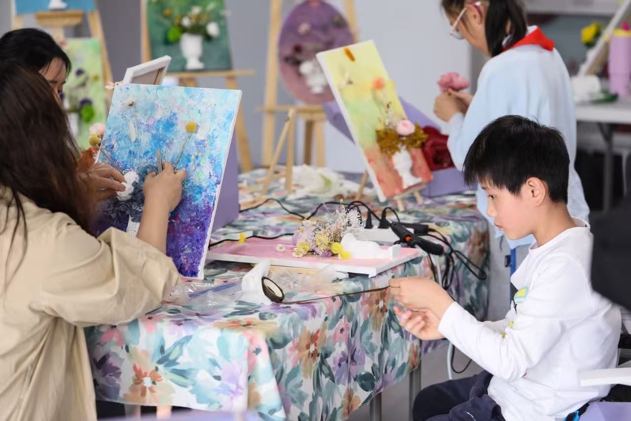 作为活动亮点,社区特邀知名艺术家赵文悉老师开展"把春天装进画框里"永生花艺术工坊。赵文悉将油画构图技法与永生花工艺相结合,引导居民和老师以花卉为媒介,将个人情感与自然意象融入创作,完成了一件件兼具视觉美感与情感温度的作品。"没想到枯花也能‘复活’成艺术,这个过程让我特别放松。"社区居民感慨道。