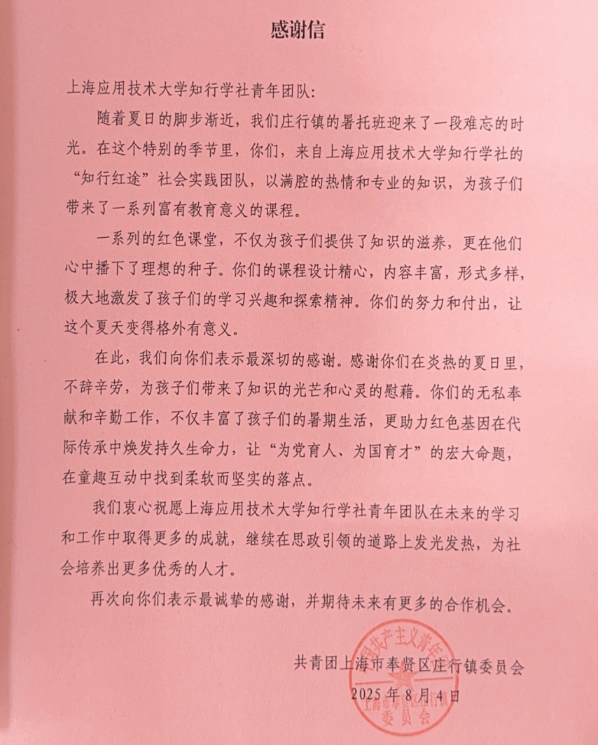 团队将大学思政理论与小学德育教育结合,打破学段壁垒,实现教育资源共享互补。孩子们在课堂上接触红色文化知识,感受思政教育魅力,进一步丰富暑期生活。知行学社青年团队获家长和社会的高度评价,共青团上海市奉贤区庄行镇委员会等单位发来感谢信,赞誉团队为思政课一体化建设提供样本,为传承红色精神、培育时代新人贡献青春力量。