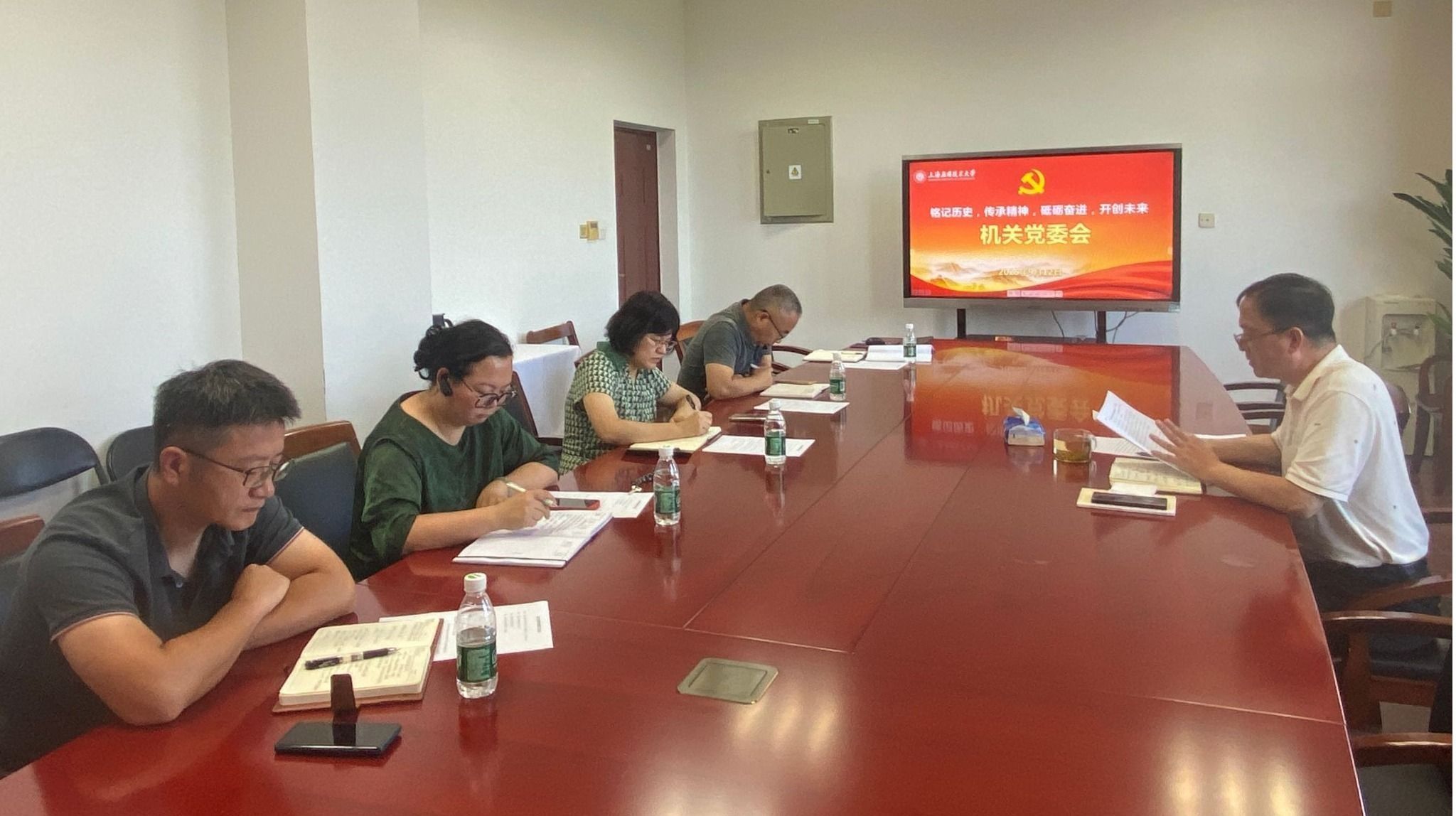 于有进带领大家集中学习了习近平总书记近期系列重要讲话精神、纪念中国人民抗日战争暨世界反法西斯战争胜利80周年大会上重要讲话以及给全国特岗教师代表重要回信精神。传达了中央和市委、市教卫工作党委、校党委部署推进作风建设常态化长效化会议精神。他指出,机关党委要持续巩固中央八项规定精神学习成果,不断深化作风建设年活动;要以党建为引领,擦亮新时代机关党的建设金色名片;要努力打造政治机关与文化机关,以政治硬杠杠和文化软实力推动各项工作;把学习成效切实转化为推动工作的智慧,以“钉钉子”精神抓好落实,推动学校机关党建工作再上新台阶,为学校教育综合改革贡献机关力量。
