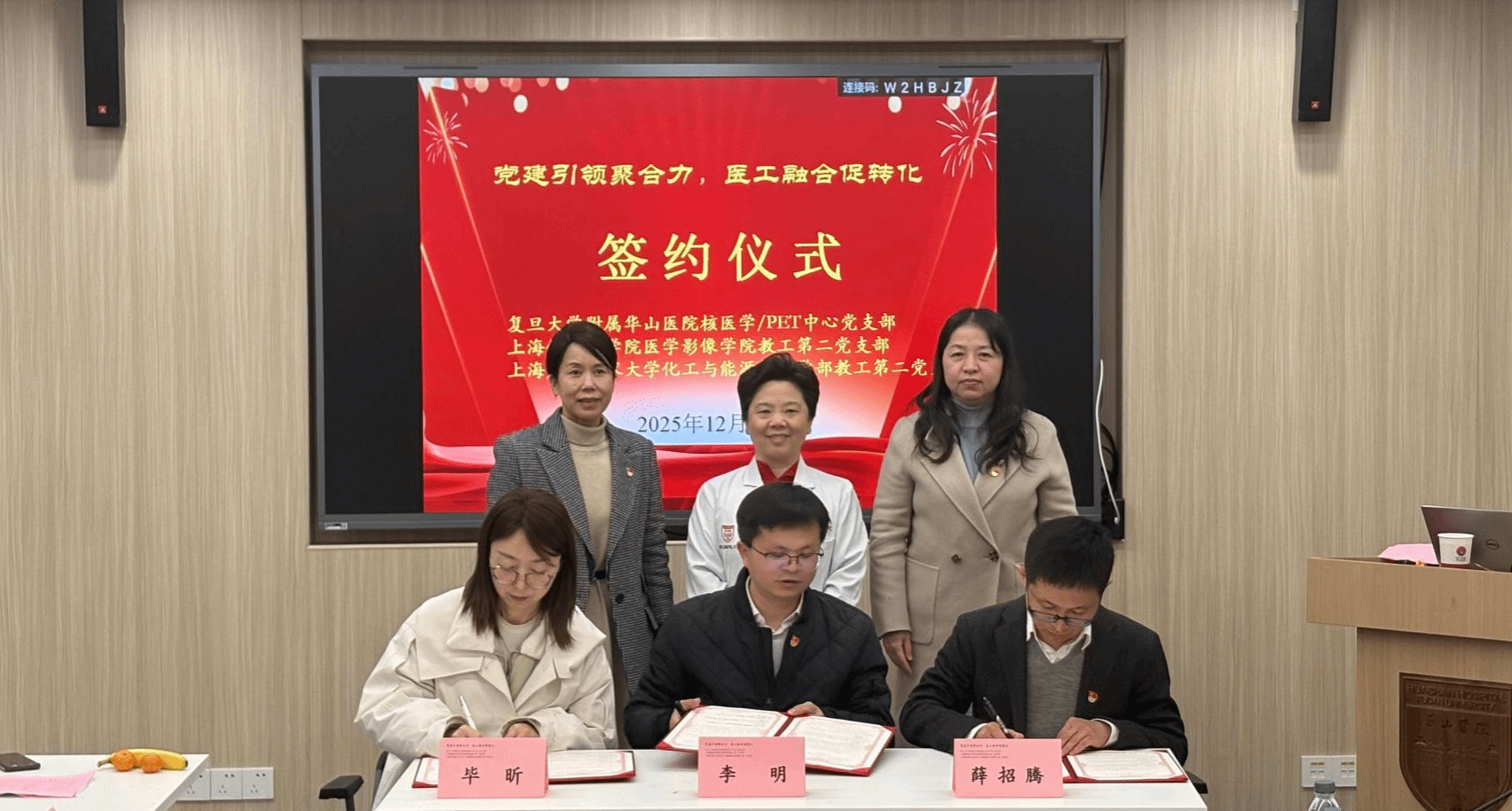 12月24日,化工与能源技术学部教工第二党支部与复旦大学附属华山医院核医学/PET中心党支部、上海健康医学院医学影像学院教工第二党支部在华山医院联合举办党建共建启动会。三方以“以共建促党建,以共建促合作,以共建促发展”为原则,共同开启医工交叉融合新篇章。活动由华山医院核医学/PET中心党支部书记李明主持。各共建单位领导及党员代表共三十余人出席会议。
