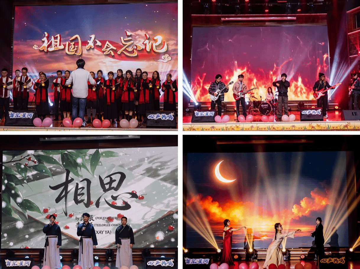 整场晚会以“科技与人文交织”为核心主线,节目形式丰富多元、内容精彩纷呈。合唱的深情婉转、朗诵的铿锵有力、乐队的热血激昂、舞蹈的灵动曼妙、民乐的悠远雅致、阿卡贝拉的纯净和谐与脱口秀的妙趣横生,构成了一场视听盛宴。教师表演庄重深情,学生创作活力四射,充分展现了学部师生多才多艺、全面发展的精神风貌。学部老挝留学生再度深情演绎在第九届中华诗词吟诵大会上斩获国际组特等奖的吟诵《相思》,共同感受跨越语言与国界的深情交流。