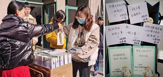 研究生入学考试已即将来临,为鼓舞经管学院考研学生士气,稳定备考心态,12月21日,经管学院毕业班辅导员们在徐汇校区看望考研学子,为同学们送上了考研大礼包。大礼包内咖啡和巧克力寓意提神助力,好运连连;同时附上了为他们加油打气的祝福语卡片。