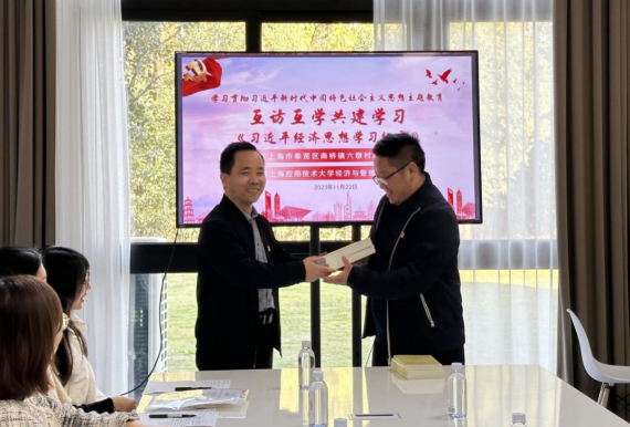 会上,双方党组织书记介绍了各自在党建工作方面的特点和资源,作为2023年上半年第一批主题教育开展单位,侯建生将学院在主题教育期间的所学所悟进行了分享,并赠送了《习近平经济思想学习纲要》。朱菁对前期的共建工作进行了总结,希望进一步深入推进合作。瞿东表示,目前村镇正在进行学习贯彻习近平新时代中国特色社会主义思想主题教育,上应大经管学院对于习近平经济思想的学习既契合了学院的专业特色,也为村党总支开展主题教育工作提供了宝贵的经验,希望通过互访互学,让主题教育走深走实。