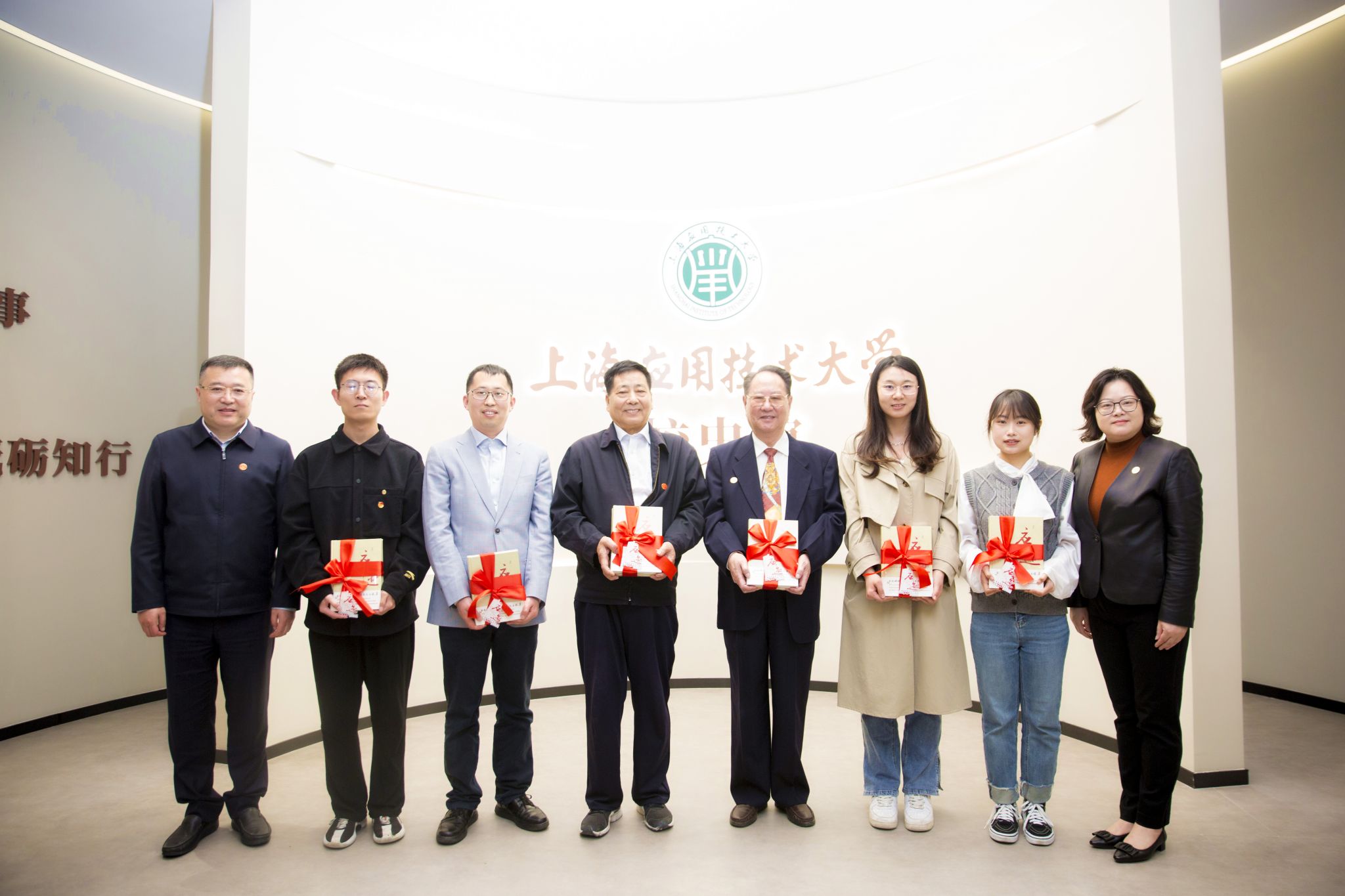 陈海瑾、李健共同向校友代表符卫国,离退休老同志代表胡大超,教师代表姜超、范敏,青年学生代表王冠、詹世韵等赠送了《应•迹——上海应用技术大学建校70周年口述史》。