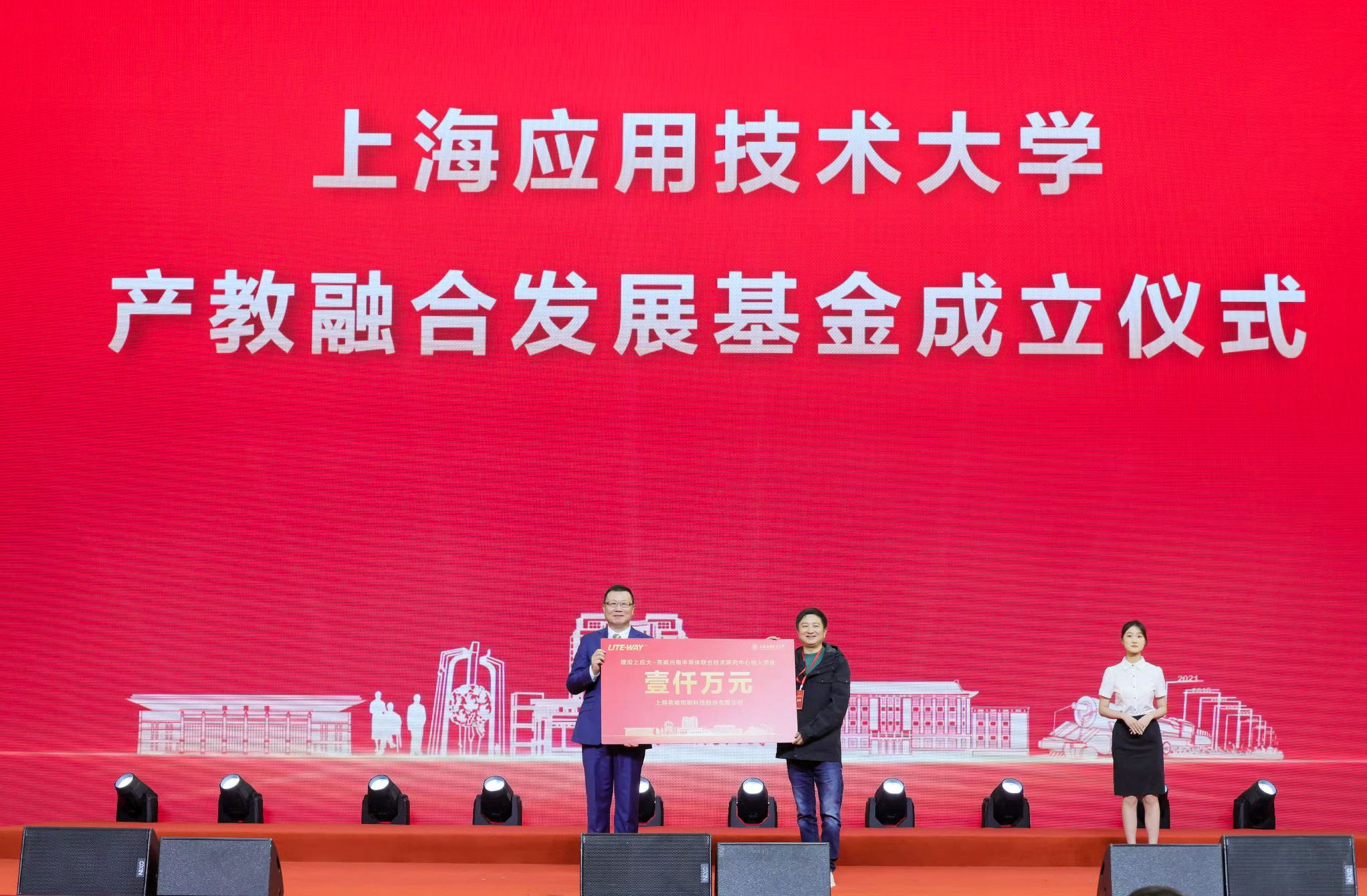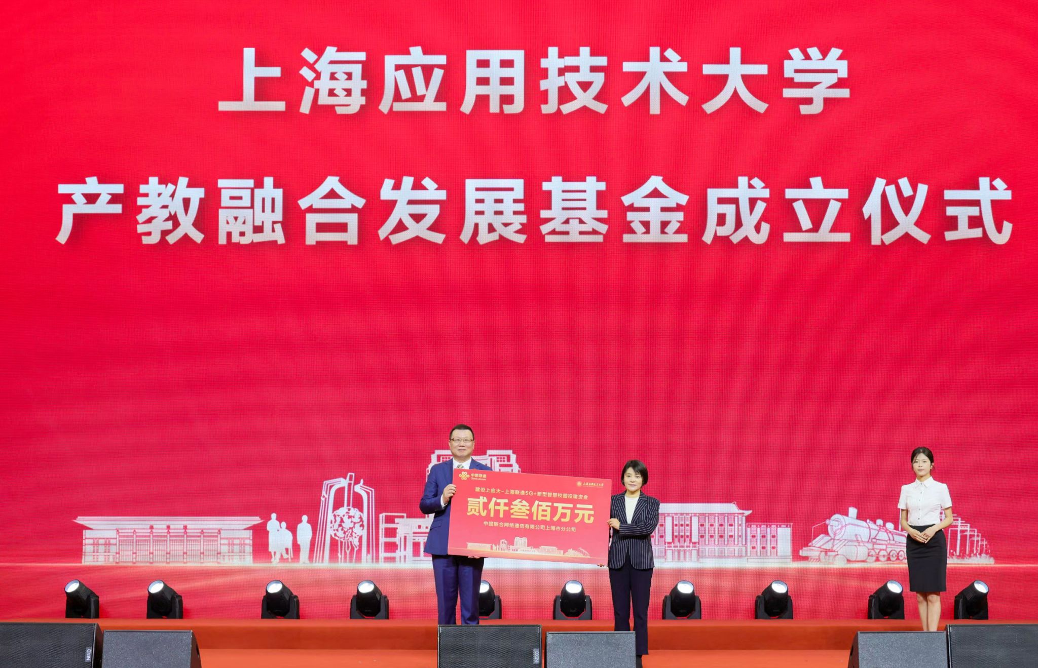 发展基金成立仪式上,中国电信上海分公司出资2300万元、中国联通上海分公司出资2300万元、上海亮威照明科技股份有限公司出资1000万元,共同设立产教融合发展基金,助力学校办学事业发展。汪小帆代表学校,接受中国电信股份有限公司上海分公司党委委员、财务总监、总法律顾问王海建,中国联通上海分公司党委委员、副总经理刘彤,上海亮威照明科技股份有限公司董事长汤雄的捐赠。