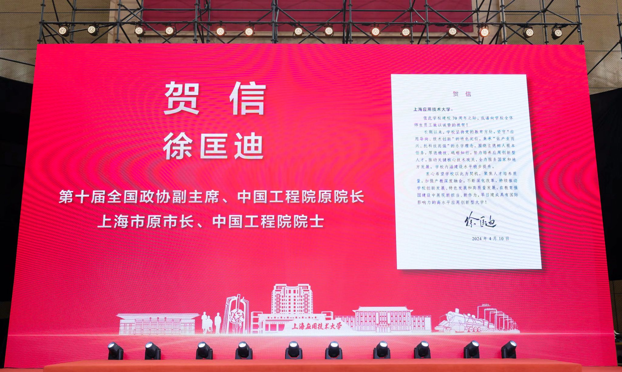 徐匡迪在贺信中勉励学校要聚焦人才培养质量,加强产教深度融合,不断深化改革,持续推动创新发展、特色发展和高质量发展,在教育强国建设中展现新担当、新作为。