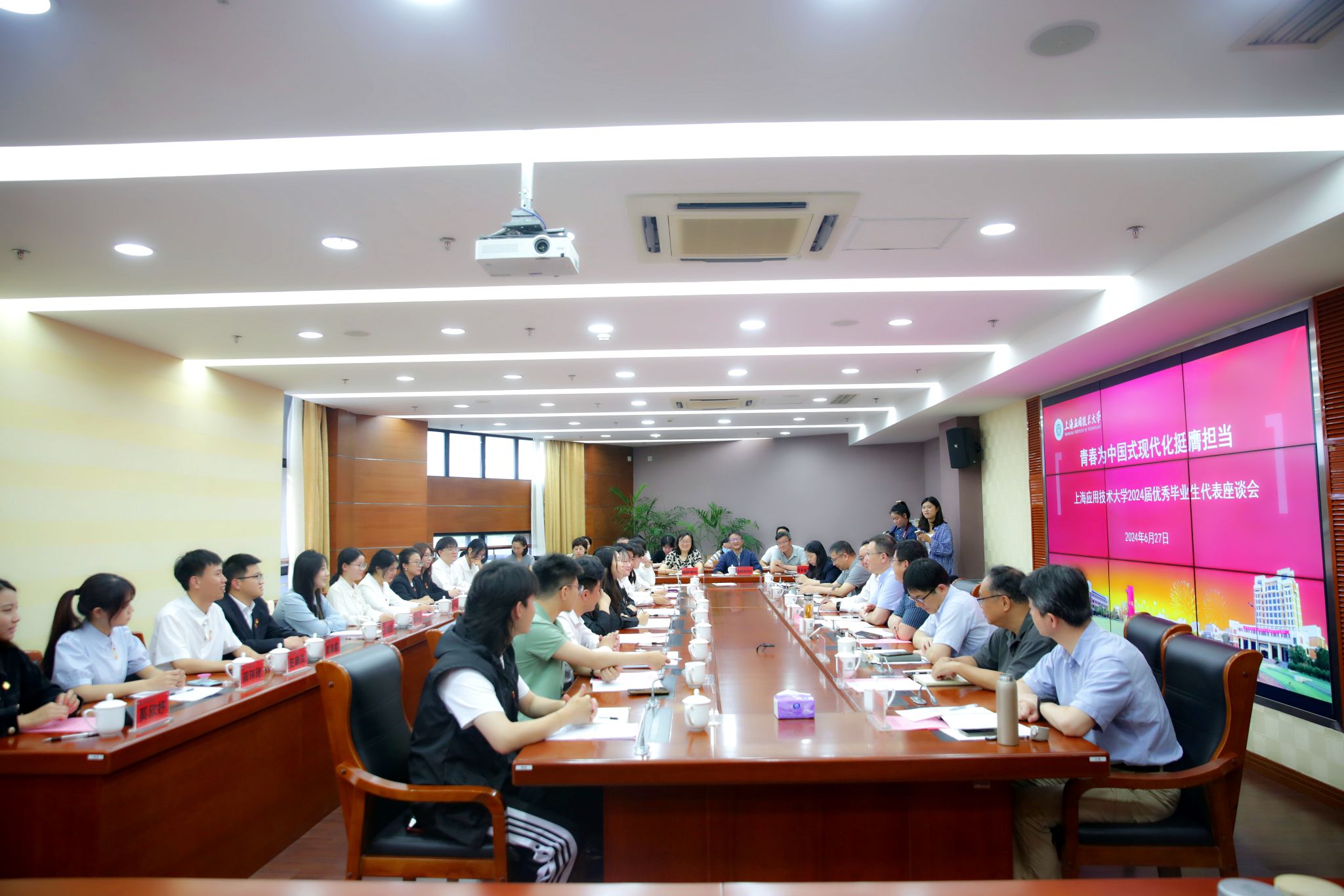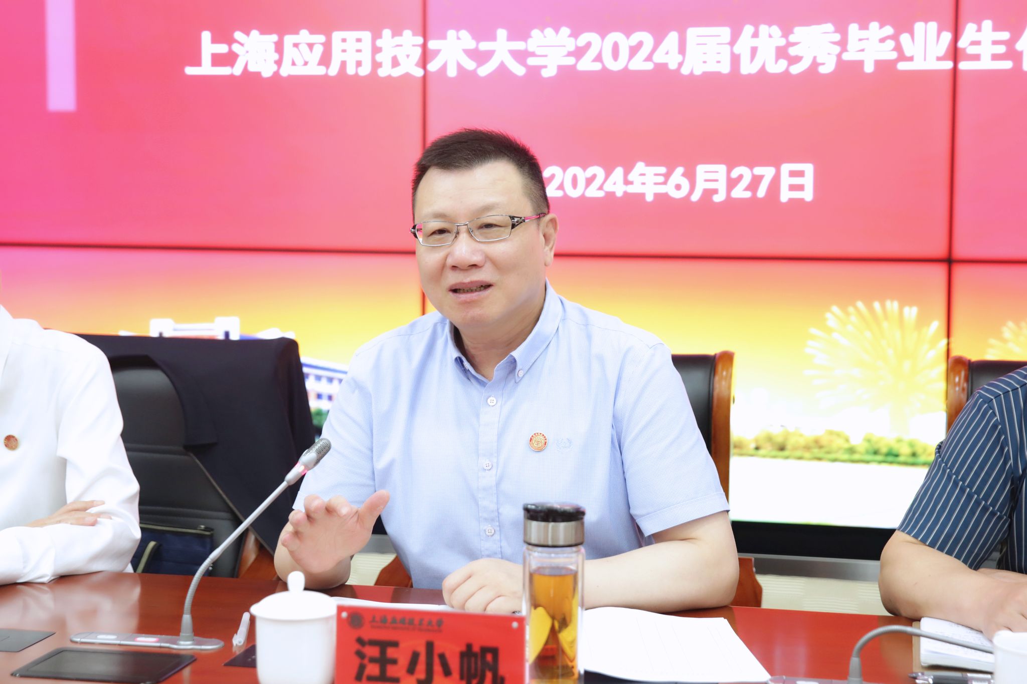 忆往昔汲取力量,谈理想奋勇担当,6月27日上午,“青春为中国式现代化挺膺担当”上海应用技术大学2024届优秀毕业生代表座谈会在奉贤校区举行,校长汪小帆出席座谈会,与优秀毕业生代表亲切交流。校党委常委、组织部统战部部长王占勇出席,党委学生工作部部长、人民武装部部长、学生处处长袁翔主持会议。