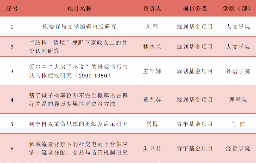 近日,教育部社科司公示了2024年度教育部人文社会科学研究规划基金、青年基金、自筹经费项目的评审结果,我校共获批6项,其中规划基金4项,青年基金2项,获批立项数创新高。