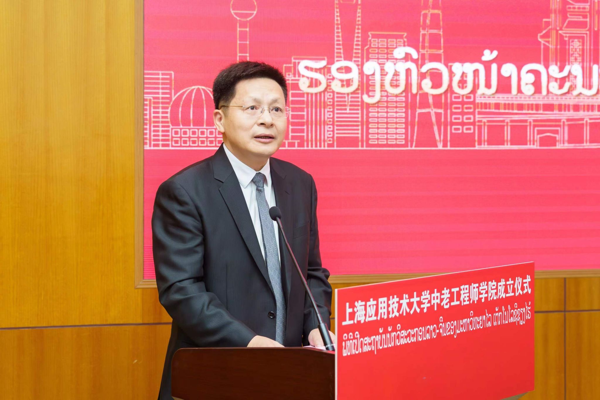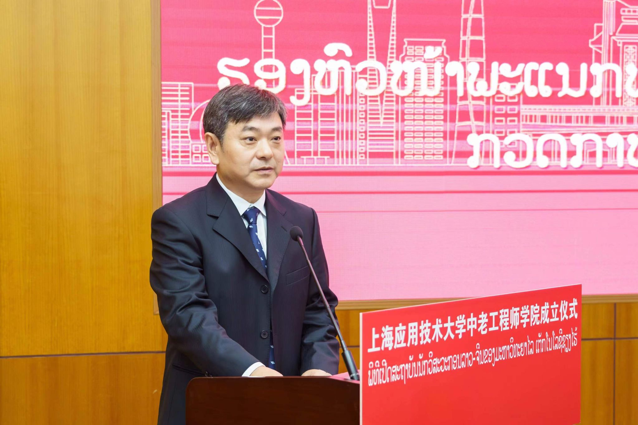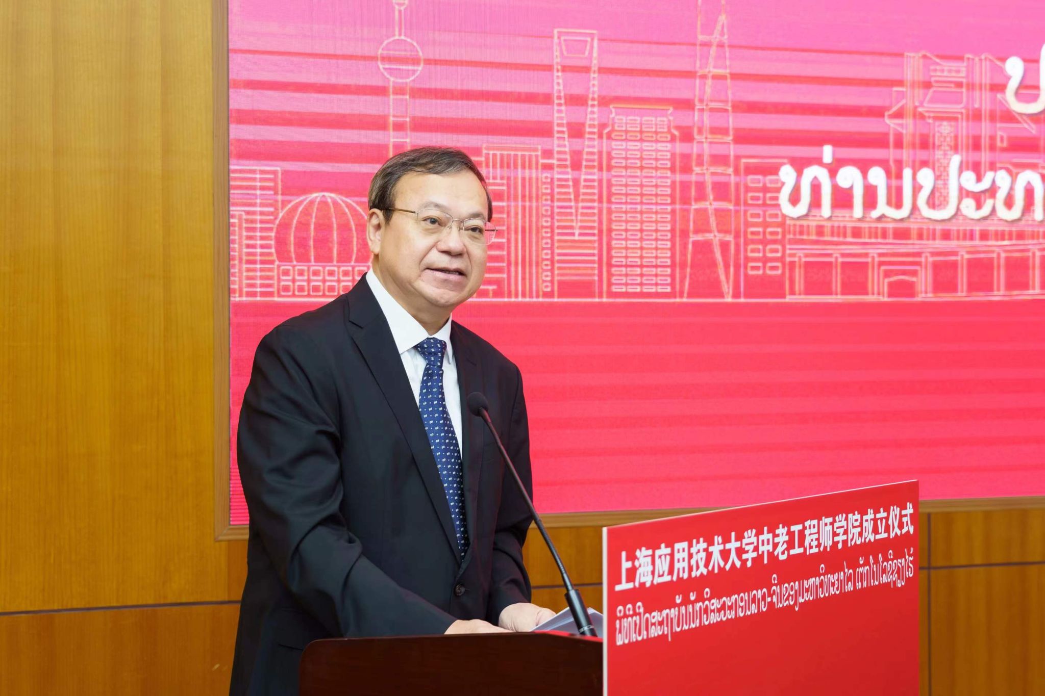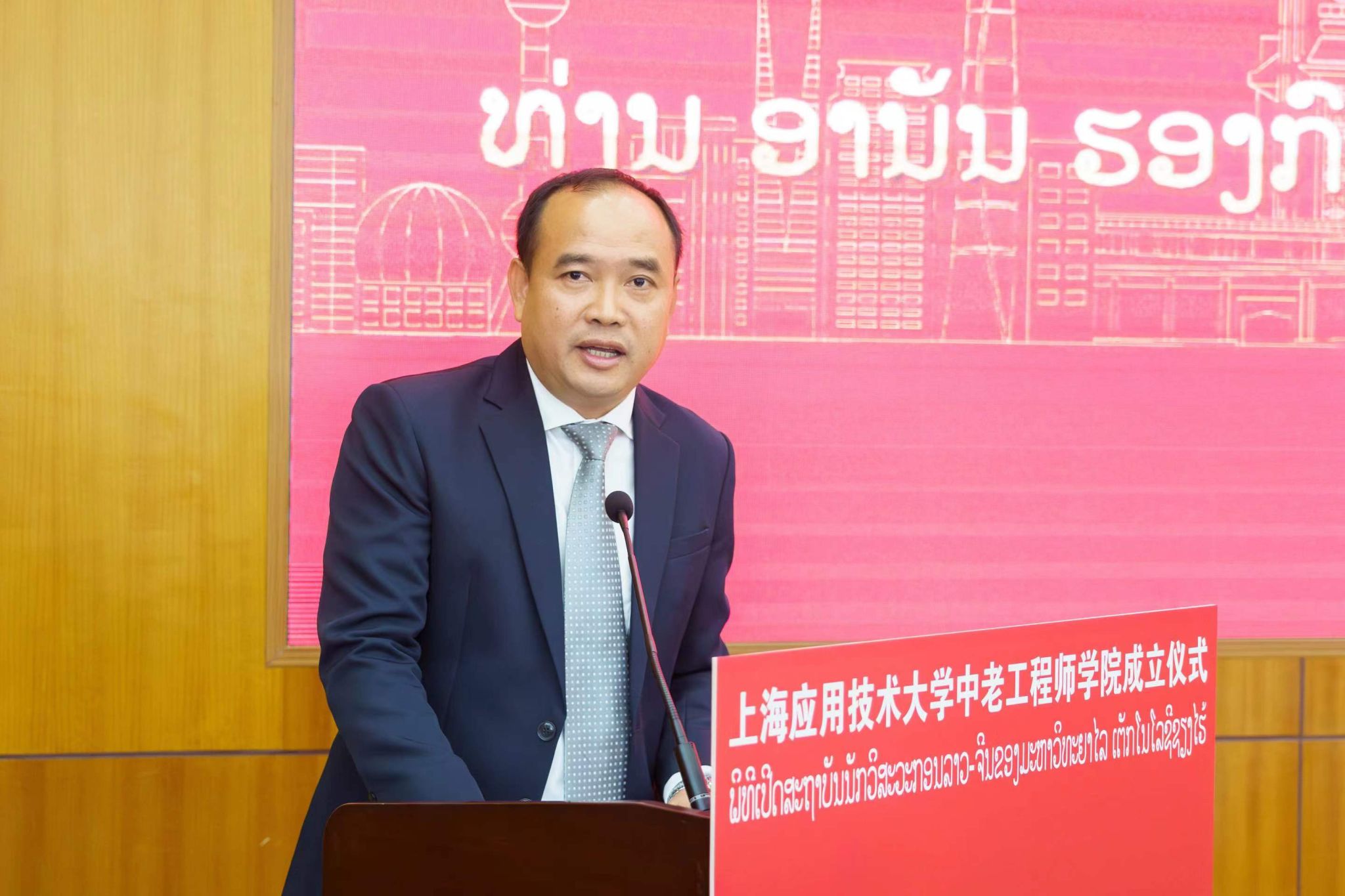 上海市教委副主任叶霖霖致辞,希望上海应用技术大学依托中老工程师学院,积极与两地相关机构、组织和企业继续携手努力,推动两地民间友好交流与合作,为中老两国全面战略合作伙伴关系的发展发挥积极作用。