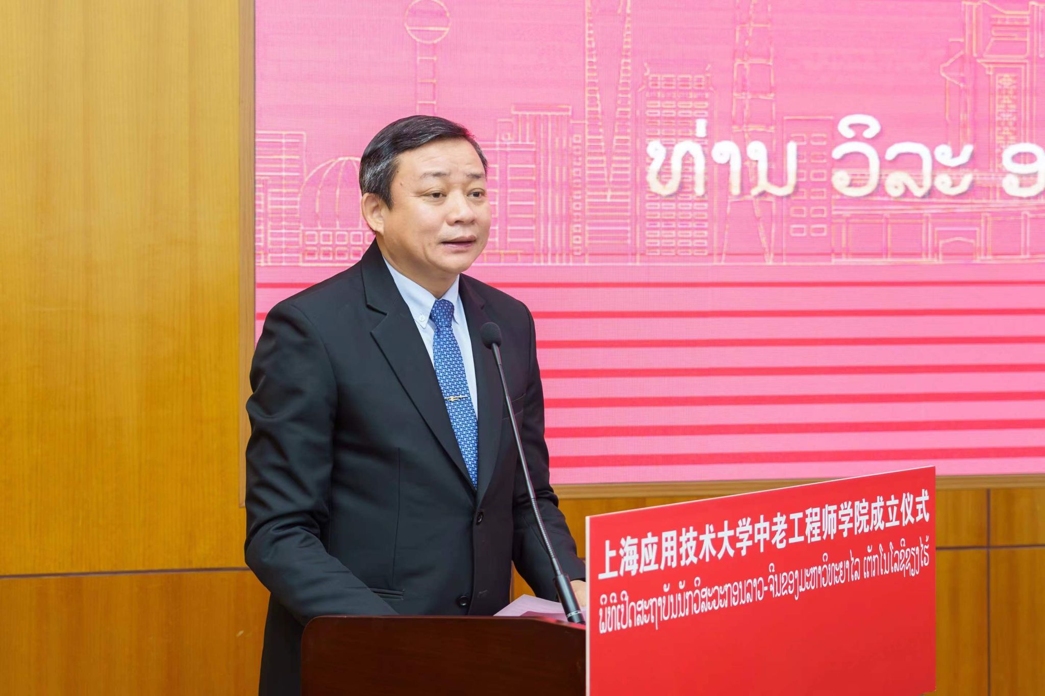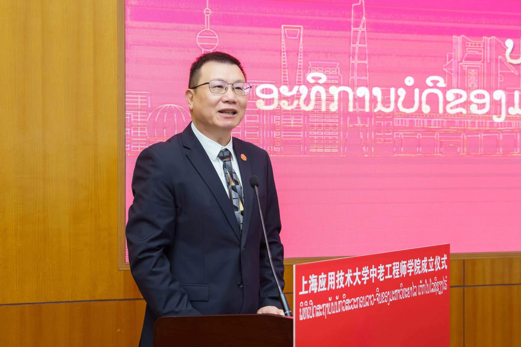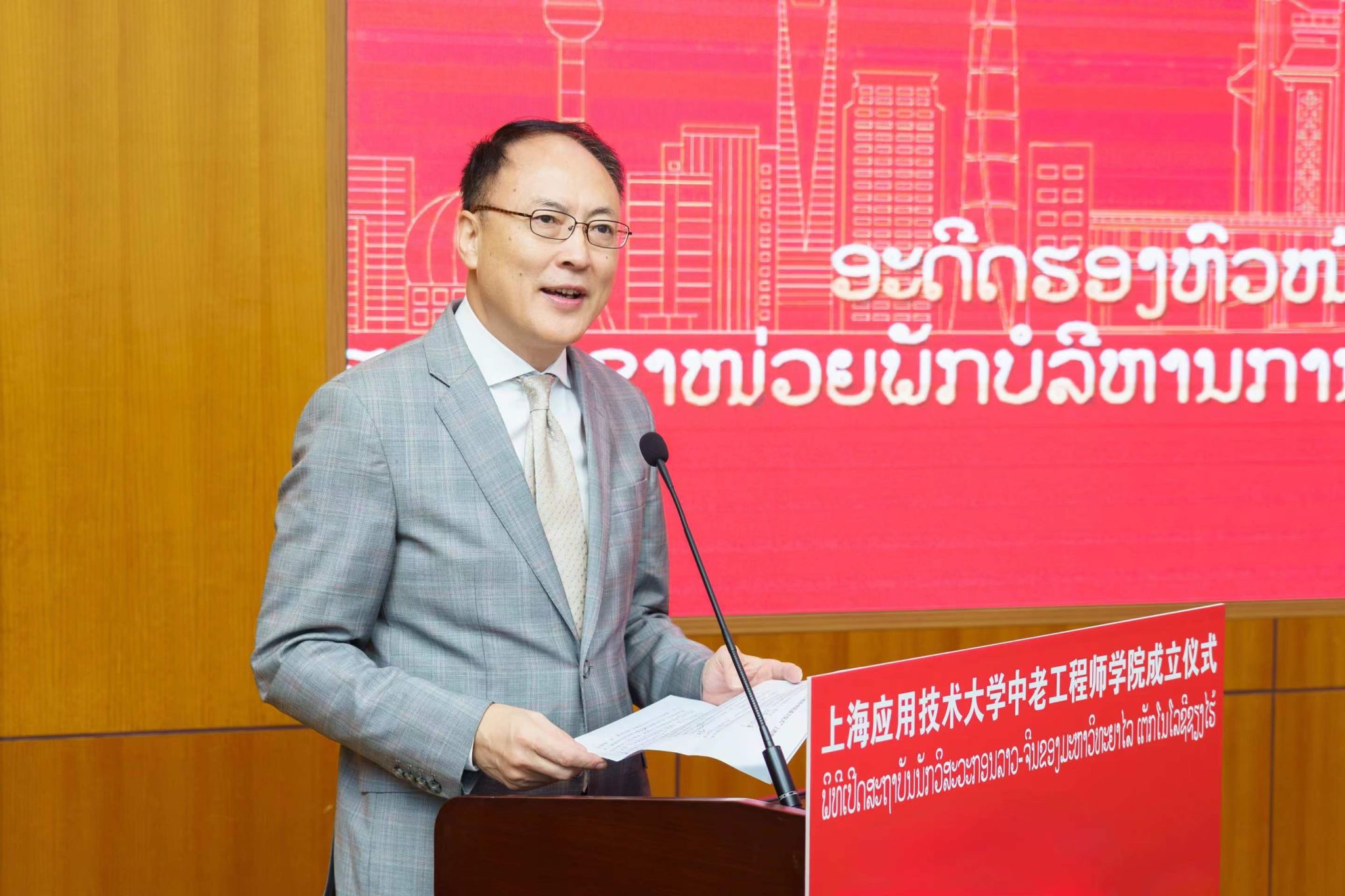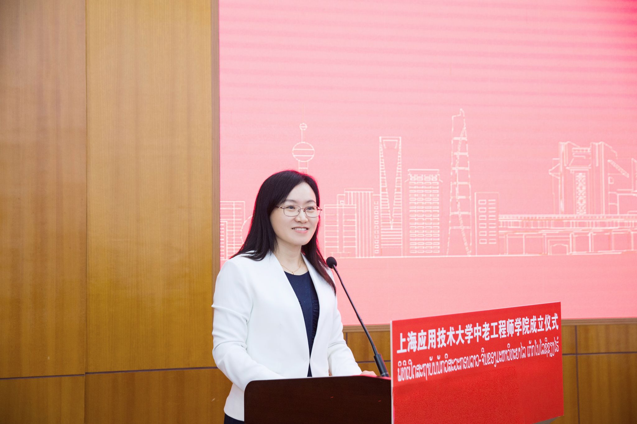 上海市教委副主任叶霖霖致辞,希望上海应用技术大学依托中老工程师学院,积极与两地相关机构、组织和企业继续携手努力,推动两地民间友好交流与合作,为中老两国全面战略合作伙伴关系的发展发挥积极作用。