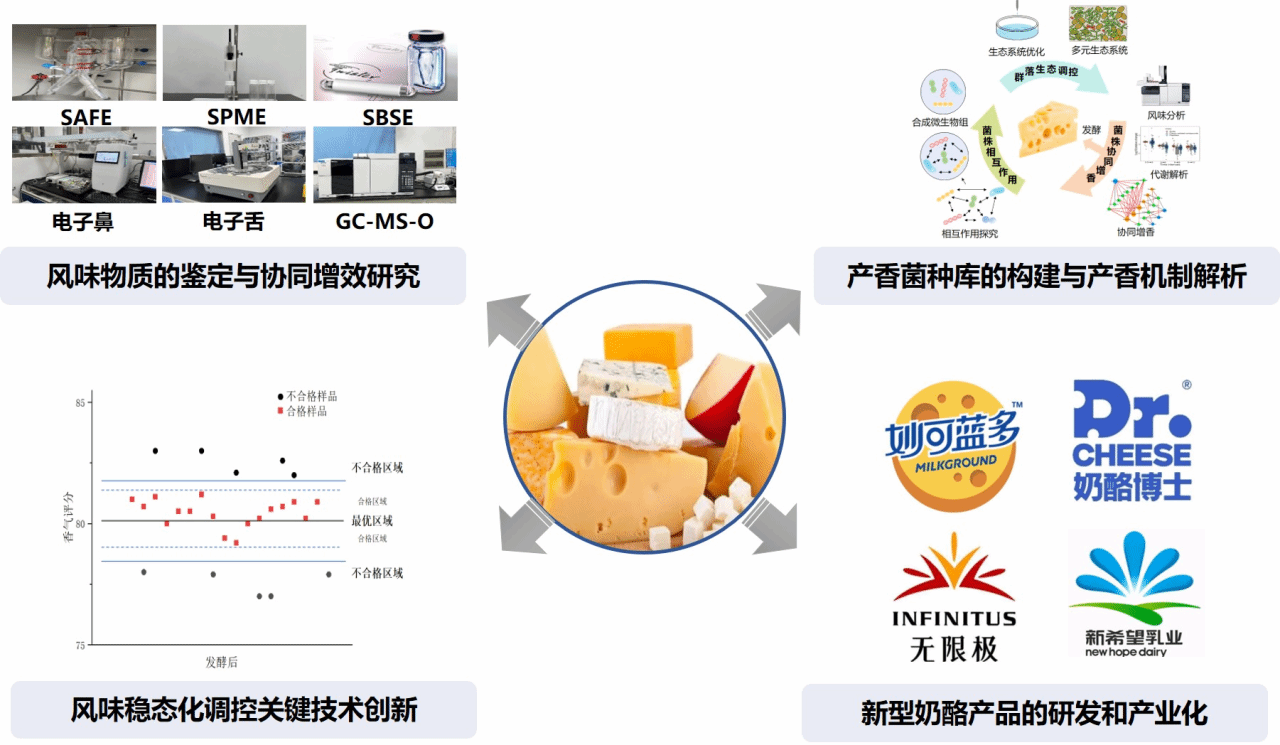 香料香精化妆品学部田怀香教授及其团队着眼于我国奶酪产业的巨大潜力及快速发展趋势,针对当前产业存在的国人对奶酪风味接受度低和风味品质不稳定等关键技术挑战,开发运用“风味协同增效”和“风味稳态化调控”两大关键技术,实现了符合国人口味的风味奶酪产品的产业化。项目通过建立奶酪风味偏好模型,确定了深受消费者喜爱的三种香型(酮香型、酯香型、醛香型)的关键风味物质。通过建立智能感官质量控制技术,构建了奶酪生产关键控制点特征指纹谱库,形成了完善的奶酪感官质量控制体系,实现了生产全过程稳态化调控。