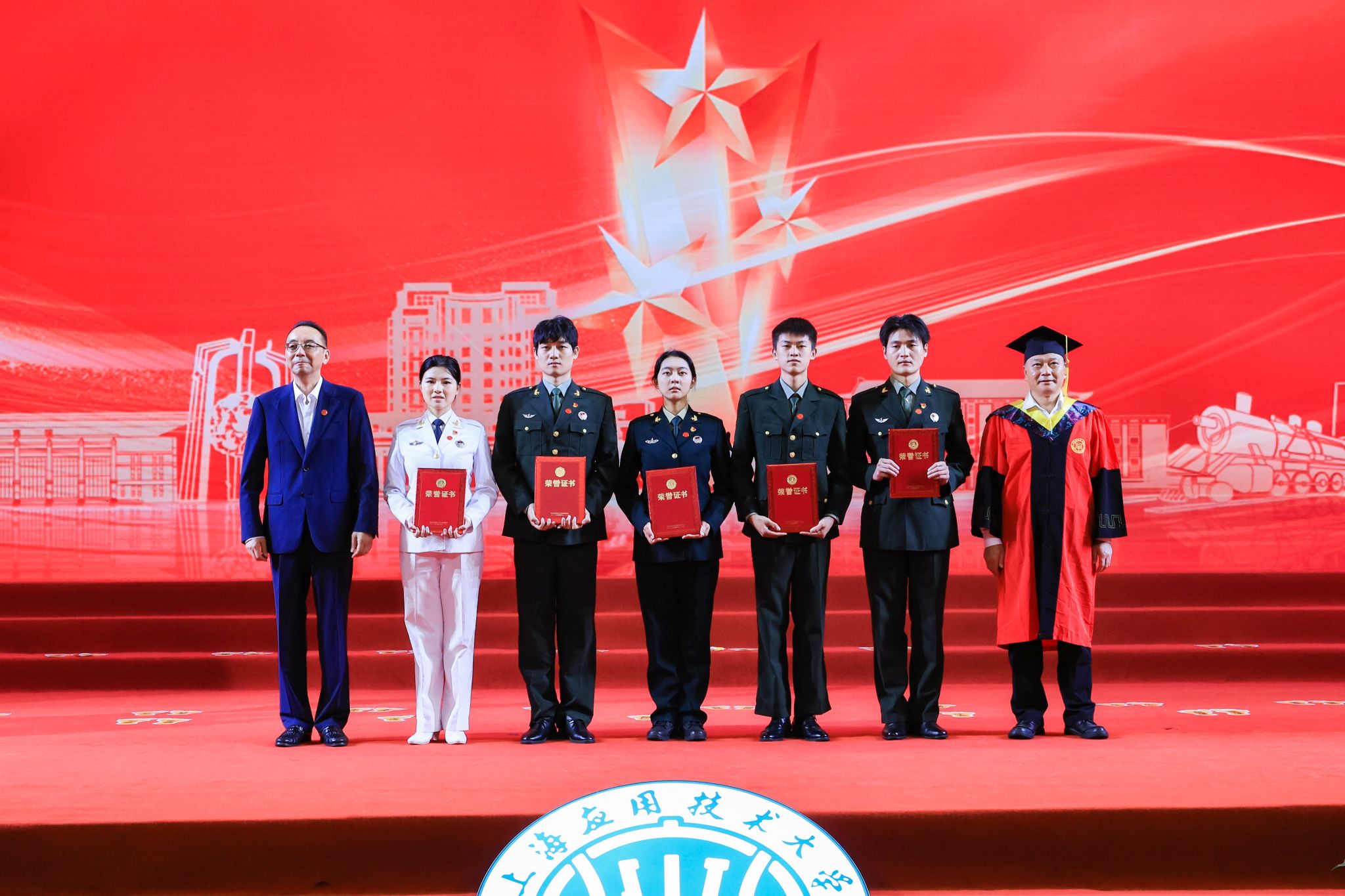 毕业典礼开始前,全体校领导与基层服务项目毕业生、上海市优秀毕业生合影留念。