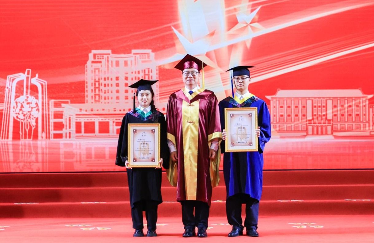 校领导为2025届优秀毕业生代表授予学位证书并拨穗。