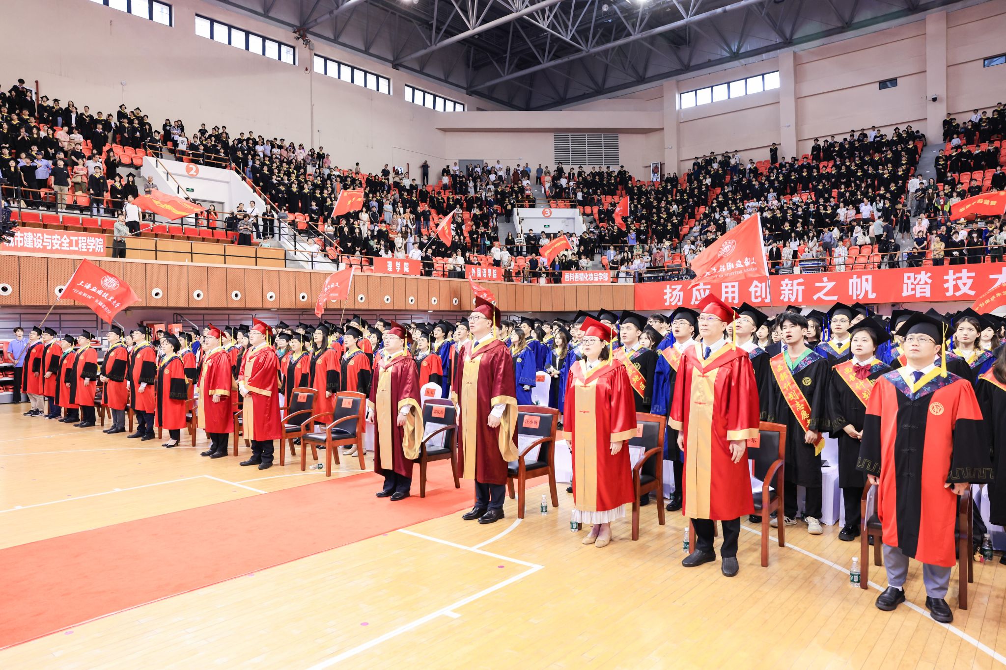 上午9时30分,在上海应用技术大学权杖引领下,校领导及主礼教授入场,庄严的国歌响起,全场师生肃立向国旗行注目礼,高唱中华人民共和国国歌,毕业典礼拉开序幕。