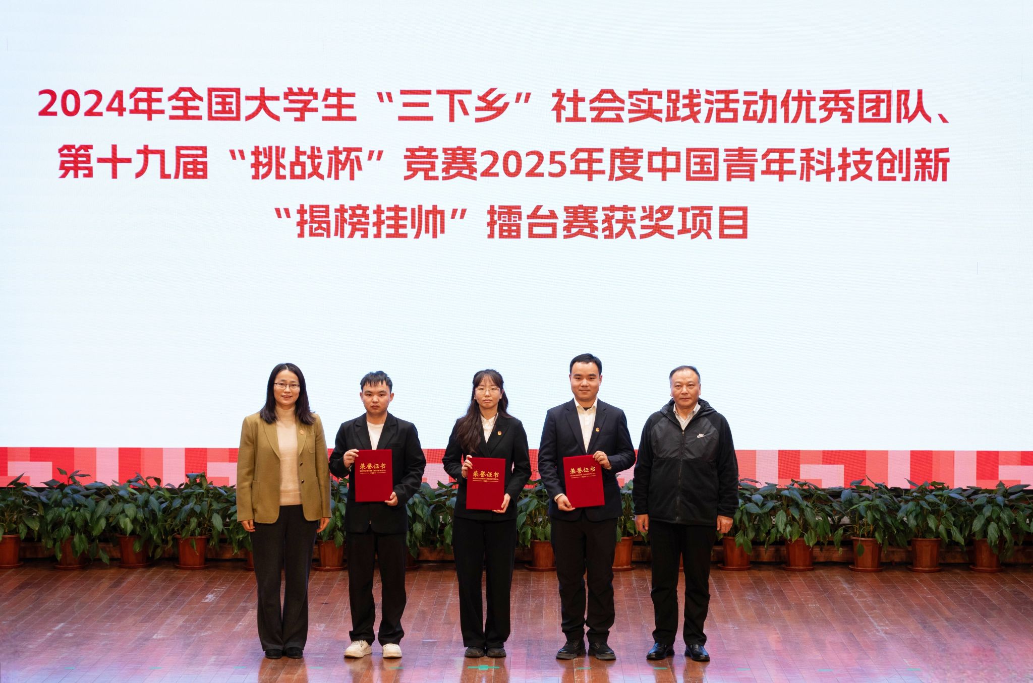 材料技术学部“研行知物”实践队服务广西易地搬迁安置点,获团中央通报表扬;此外,学部两支团队在“挑战杯”全国“揭榜挂帅”擂台赛中,斩获1项全国特等奖、1项三等奖,刷新学校赛事纪录。现场播放的专题视频,再现了获奖团队攻坚克难的创新之路与朝气蓬勃的青春风采。