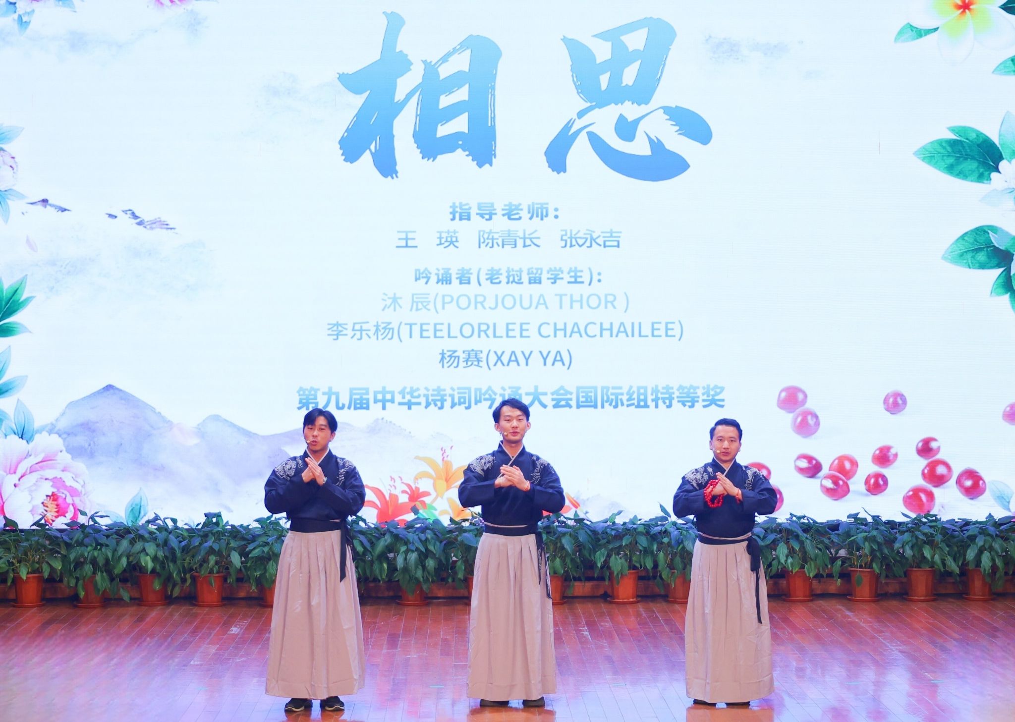 值得关注的是,在第九届中华诗词吟诵大会上,我校老挝留学生凭借《相思》吟诵脱颖而出,斩获国际组特等奖。现场,智能技术学部沐辰、杨赛、李乐杨三位老挝留学生再度深情演绎,展现了中外文化交融的魅力,也成为学校国际化育人成果的生动注脚。