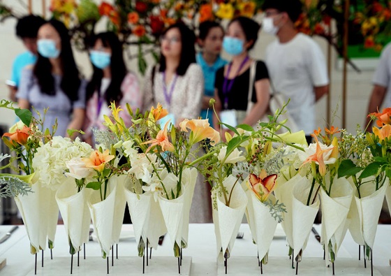 6月13日,第45届世界技能大赛花艺项目冠军、上海应用技术大学学生陆亦炜在介绍自己的“母亲花”花艺作品。