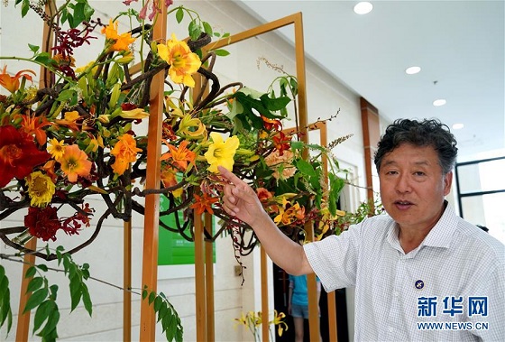 6月13日,第45届世界技能大赛花艺项目冠军、上海应用技术大学学生陆亦炜在介绍自己主持设计和创作的花艺作品。 当日,“2020中国(上海)萱草文化节”在上海应用技术大学开幕,校园里数百个品种的萱草花竞相绽放,萱草科研推广、萱草文化交流等多项活动同时举行。 新华社记者刘颖摄