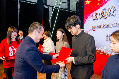 12月26日,“爱国情 强国志 报国行”2019上海青年大学生马克思主义理论学习大比武主题活动展示暨表彰大会在上海戏剧学院举行。一位漂亮的女孩上台领奖,并一字一句地说着获奖感言。女孩所在的团队获得了该活动“我心中的思政课”——上海高校大学生微电影二等奖,台下的掌声热烈。